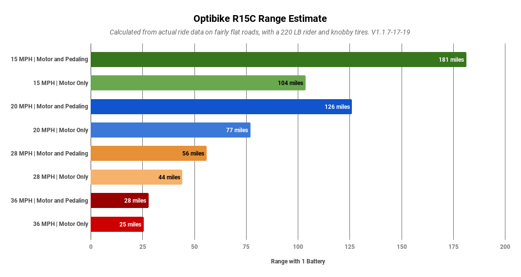 Riding at 15 mph with pedaling gives the longest range at 181 miles. If you ride at 15 mph without pedaling then the range is 104 miles. Most bike paths have a speed limit of 15 mph and so this is a great test for bike path riding. The R15C in Power Level 1 is limited to 15 mph and the test was done in this power level. This is also the most subjective range, as it is essay to pedal at 15 mph and get infinite mileage. Tire friction is also a main factor at this speed, so a road tire would give a 10-20% improvement in range.